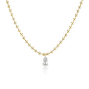 A 1.01 carat elongated pear shaped diamond floats between golden spheres. Crafted in 14k yellow gold, the Diamond Aria Chain layers effortlessly with other pieces and is the perfect compliment to a t-shirt or an evening gown. We love to pair this necklace with our Gemini Bolo.