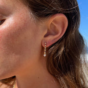 Our Kin Droops feature a single heart shaped white diamond floating on a slinky, buttery ball chain. The casual energy of the ball chain paired with luxe white diamonds creates the ultimate transitional earring, perfect for causal errands or a night out. The fluidity of the chain creates eye catching movement on the ear. Light as a feather, you'll forget they are there. The Droops can be worn simply as chain hoops in one piercing or across multiple piercings to create a layered look.