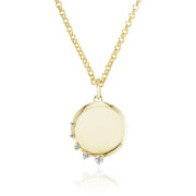 The cool little sister of our Eclipse Pendant. The Mini Eclipse Pendant features a half halo of round brilliant diamonds, mimicking the sun's rays during a partial eclipse. The beveled edge adds depth and dimension to this cosmic charm.