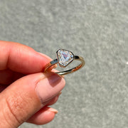 The Bezzy features a thread of gold that traces the outline of the diamond. Band shape can be customized, shown here with a square profile band.