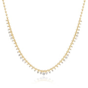 Undulating diamonds float between golden spheres, striking the perfect balance between industrial and delicate. The movement created by the free floating settings gives the illusion of diamond droplets dancing on the skin. Our bestselling Kin Necklace is the perfect compliment to a t-shirt or an evening gown.